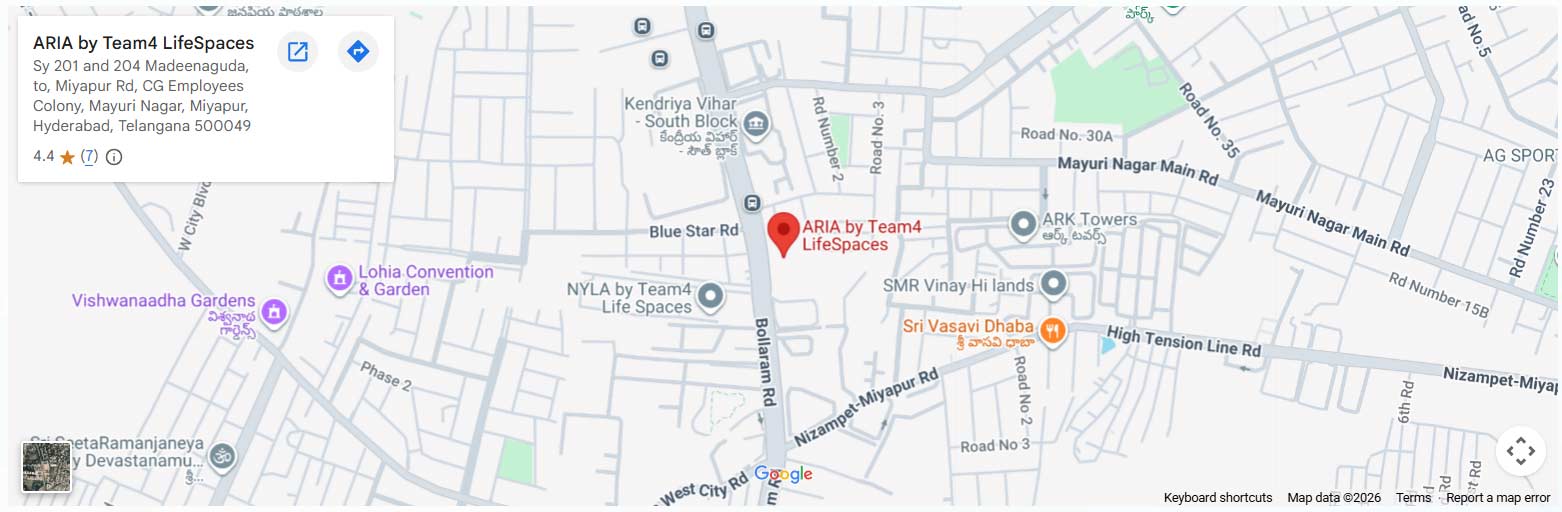 Team4 ARIA is set to transform luxury living in Miyapur, Hyderabad, with its iconic 48-floor high-rise towers, making it one of the tallest residential developments in the area. Spread across 12.5 acres of thoughtfully planned land, the project offers nearly 80% open space, creating a serene and spacious living environment. The development comprises seven magnificent towers featuring approximately 3,000 premium residences designed for modern urban lifestyles.